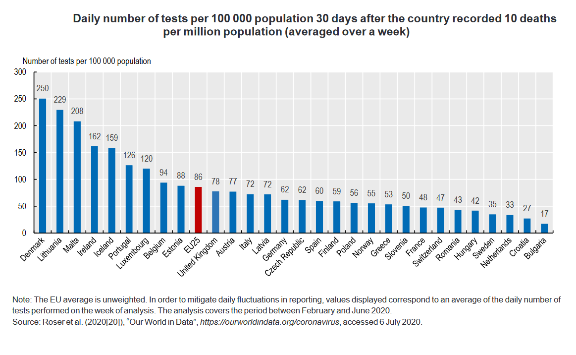 Μάλιστα από την παραπάνω Μελέτη του ΟΟΣΑ προκύπτει ότι η Ελλάδα καταλαμβάνει την 20η θέση ανάμεσα σε 29 συγκρινόμενες ευρωπαϊκές χώρες με 53 ημερήσια τεστ κορονοϊού ανά 100.000 κατοίκους, ενώ η Πορτογαλία στην 6η θέση με 126 ημερήσια τεστ κορονοϊού ανά 100.000 κατοίκους και το Βέλγιο στην 8η θέση με 94 ημερήσια τεστ κορονοϊού ανά 100.000 κατοίκους (Πίνακας 3).