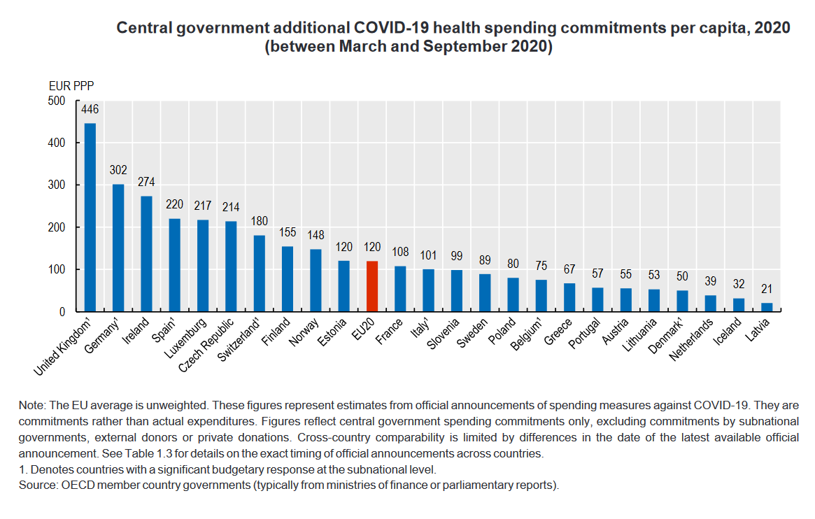 Και ενώ ενόψει των τεράστιων αναγκών του εθνικού συστήματος υγείας της Πατρίδας μας θα περίμενε κανείς η κυβέρνηση να δώσει πολλά χρήματα για την ενίσχυσή του, τελικά από την παραπάνω Μελέτη του ΟΟΣΑ προκύπτει ότι σε επίπεδο επιπλέον δαπανών υγείας λόγω Covid-19 για το διάστημα Μάρτιος- Σεπτέμβριος 2020 η Ελλάδα καταλαμβάνει την 20η θέση ανάμεσα σε 24 ευρωπαϊκές χώρες με επιπρόσθετη δαπάνη 67 εκατ. ευρώ (Πίνακας 1).