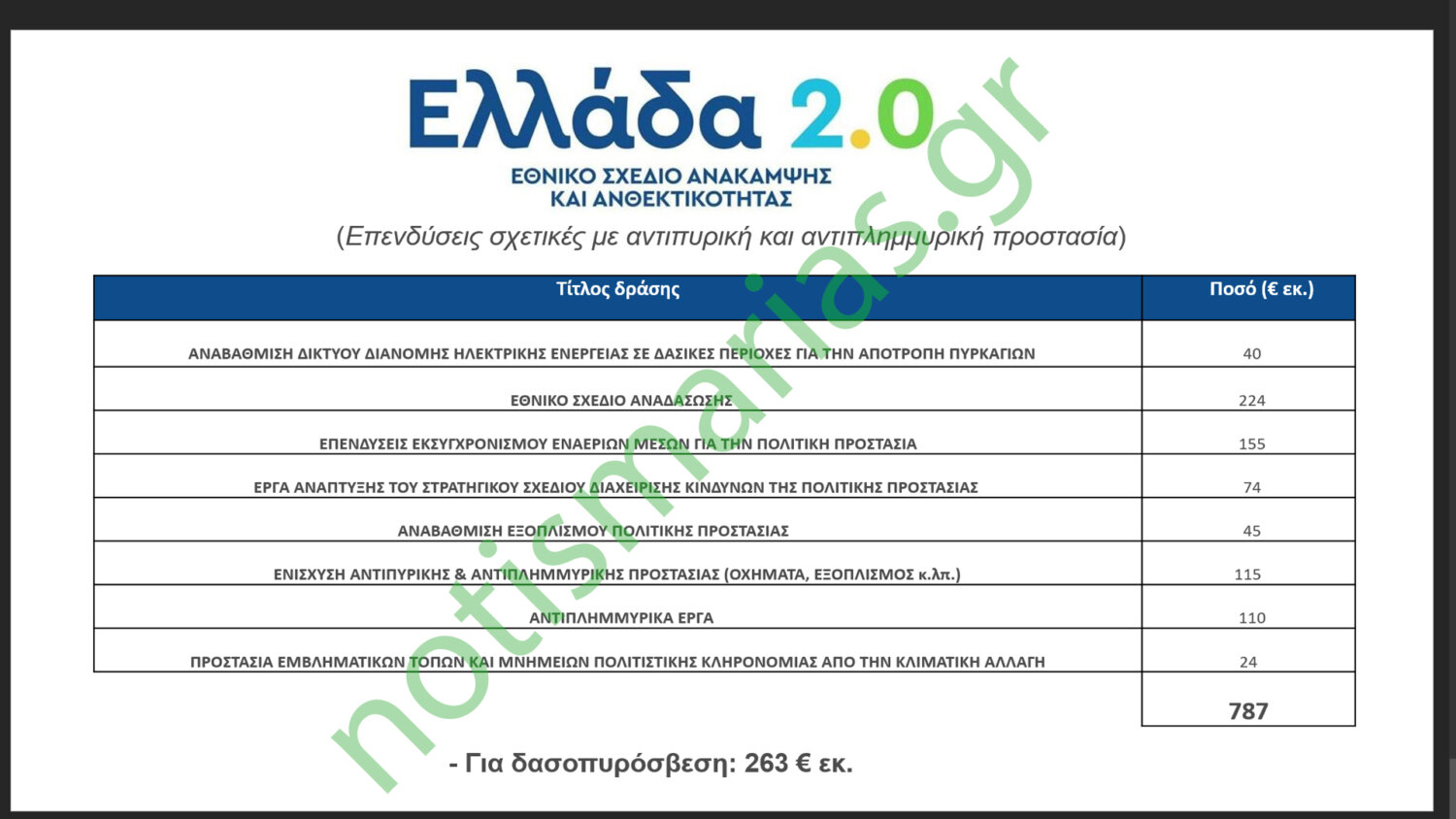 Από τα 30,5 δις ευρώ του σχεδίου «Ελλάδα 2.0» μόνο 787 εκατ. ευρώ προβλέπονται για «επενδύσεις» σχετικές με αντιπυρική και αντιπλημμυρική προστασία.