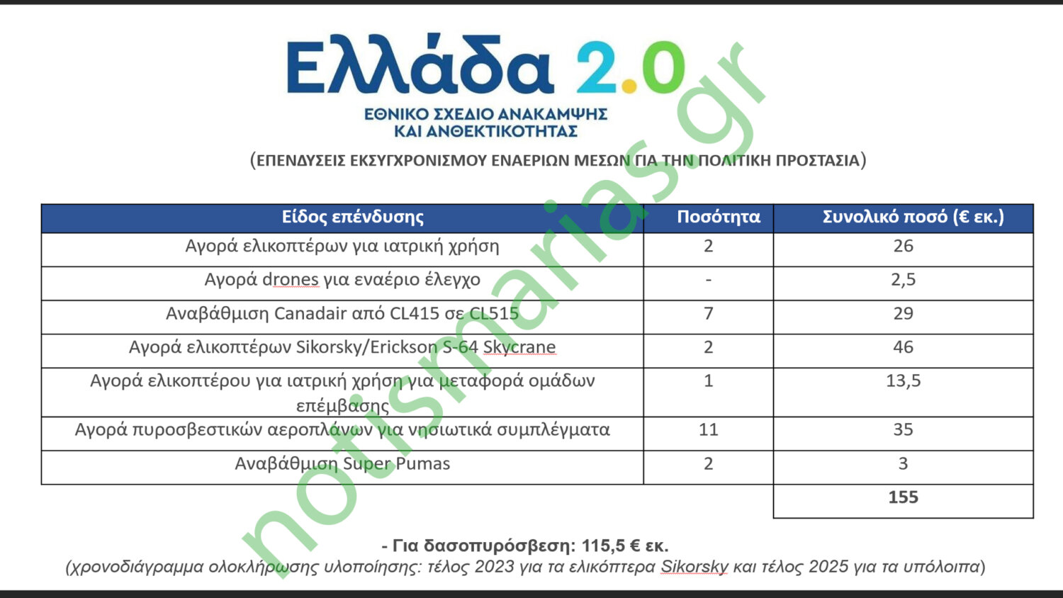 Όπως προκύπτει από τον Πίνακα 2 τον οποίο διαμόρφωσα για δασοπυρόσβεση θα πάνε μόνο 115,5 εκατ. ευρώ, ενώ το χρονοδιάγραμμα ολοκλήρωσης της υλοποίησης είναι τέλος 2023 για τα ελικόπτερα Sicorsky και τέλος 2025 για τα υπόλοιπα.