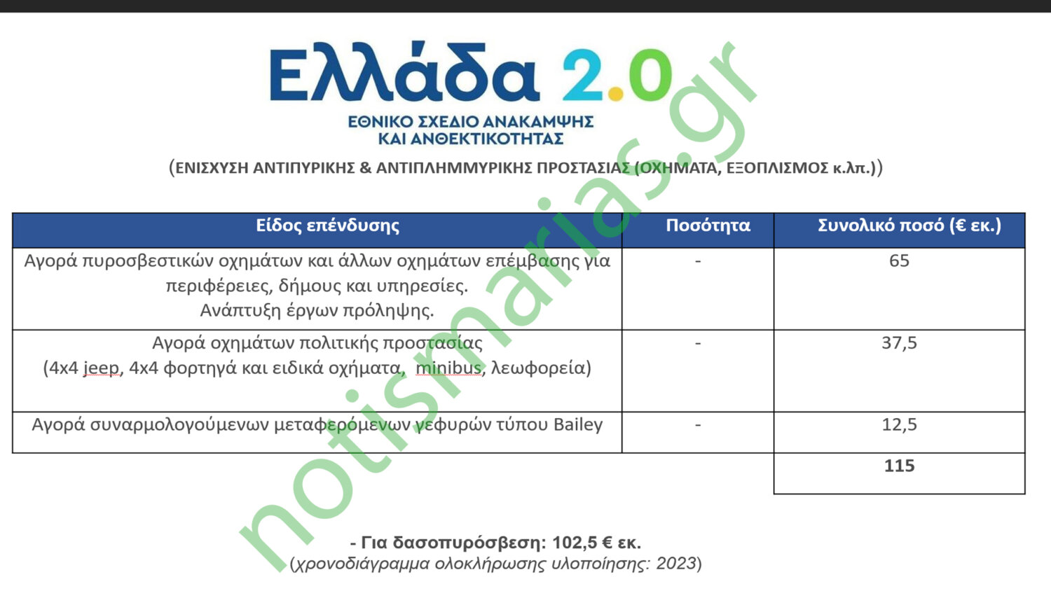 Το έργο αφορά την προμήθεια πυροσβεστικών και άλλων οχημάτων και εξοπλισμού για Περιφέρειες και Δήμους καθώς και για την Πολιτική Προστασία. Όπως προκύπτει από τον Πίνακα 3 τον οποίο διαμόρφωσα για δασοπυρόσβεση θα πάνε μόνο 102,5 εκατ. ευρώ, ενώ το χρονοδιάγραμμα ολοκλήρωσης της υλοποίησης είναι το 2023.