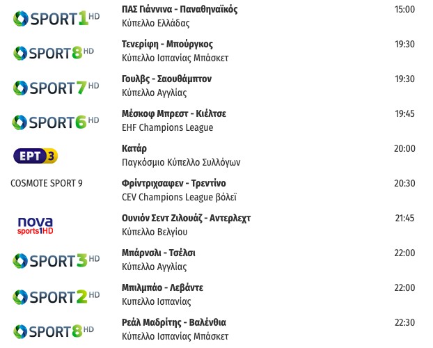 Αναλυτικά οι αθλητικές μεταδόσεις της Πέμπτης