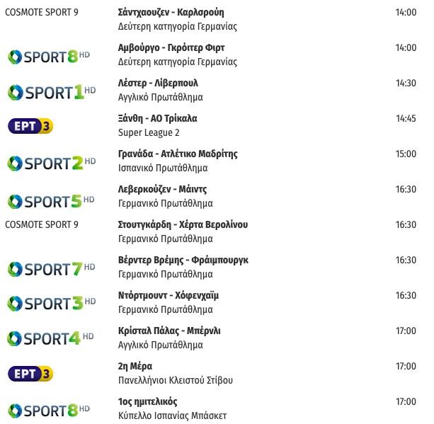 Αναλυτικά οι αθλητικές τηλεοπτικές μεταδόσεις του Σαββάτου: