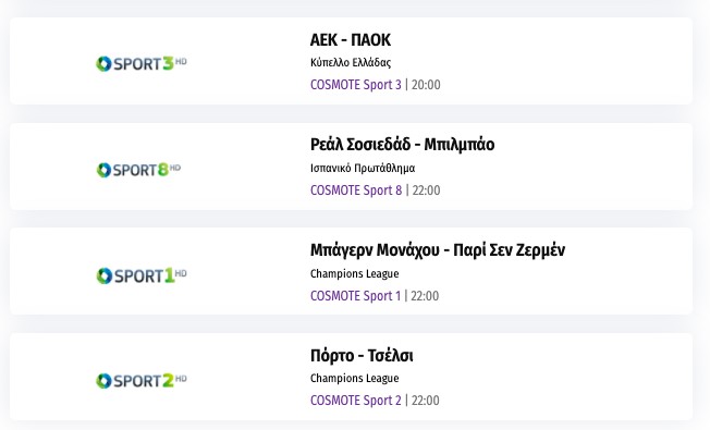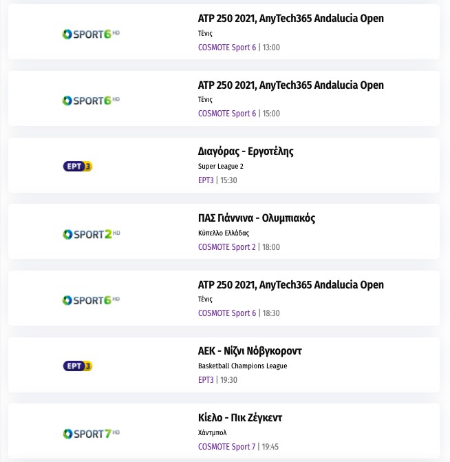 Αναλυτικά το αθλητικό τηλεοπτικό πρόγραμμα της ημέρας: