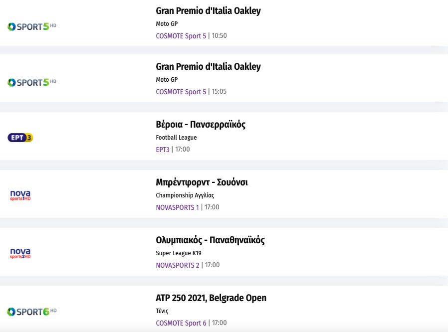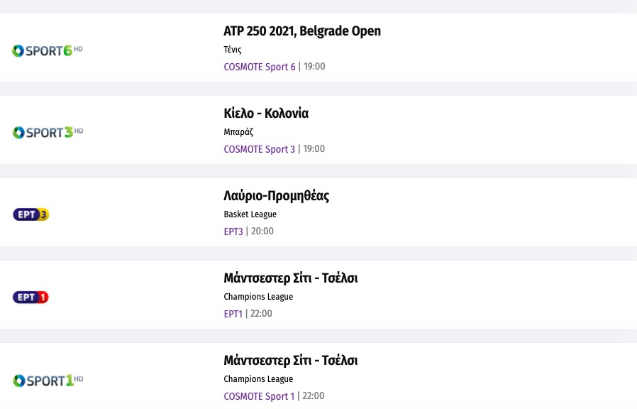 Αναλυτικά το αθλητικό τηλεοπτικό πρόγραμμα της ημέρας: