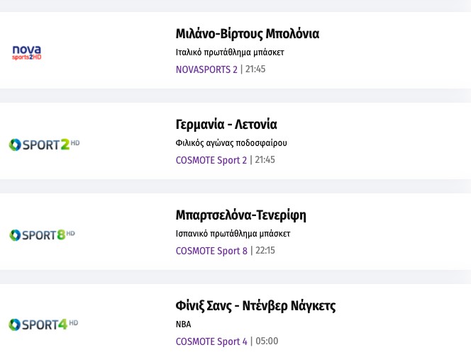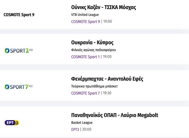 Αναλυτικά το σημερινό τηλεοπτικό αθλητικό πρόγραμμα: