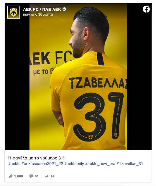«Η ΠΑΕ ΑΕΚ ανακοινώνει την μεταγραφή του Γιώργου Τζαβέλλα από την τουρκική Αλάνιασπορ. Ο Έλληνας διεθνής αμυντικός υπέγραψε συμβόλαιο με την ομάδα μας έως το καλοκαίρι του 2023 και πήρε τη φανέλα με το νούμερο 31.
