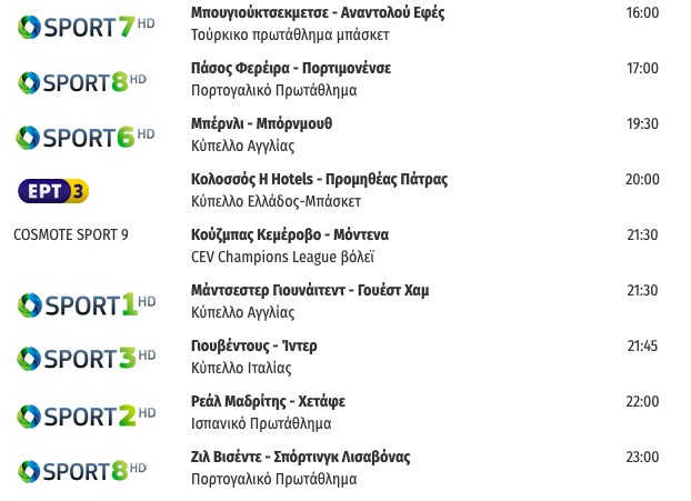 Αναλυτικά οι αθλητικές μεταδόσεις της μέρας: