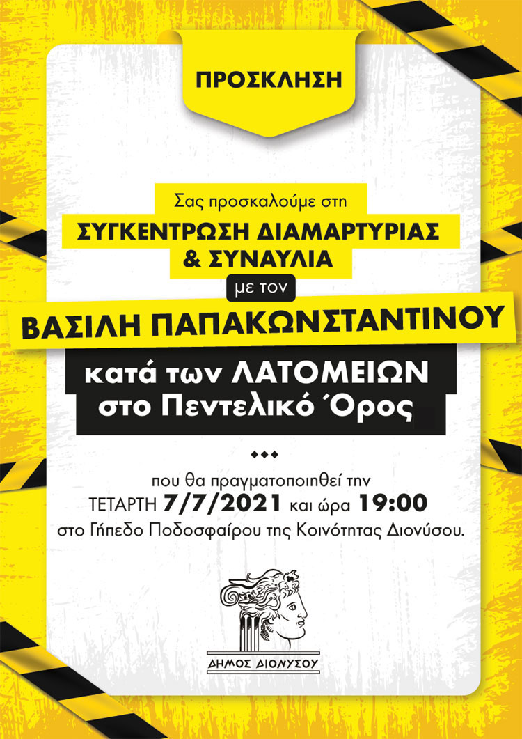 Ο Δήμος Διονύσου, με τη συμπαράσταση των Δήμων Πεντέλης, Κηφισιάς και του ΣΠΑΠ, προσκαλεί στη Συναυλία - Συγκέντρωση Διαμαρτυρίας κατά των Λατομείων στη Ραπεντώσα και στο Πεντελικό Όρος.