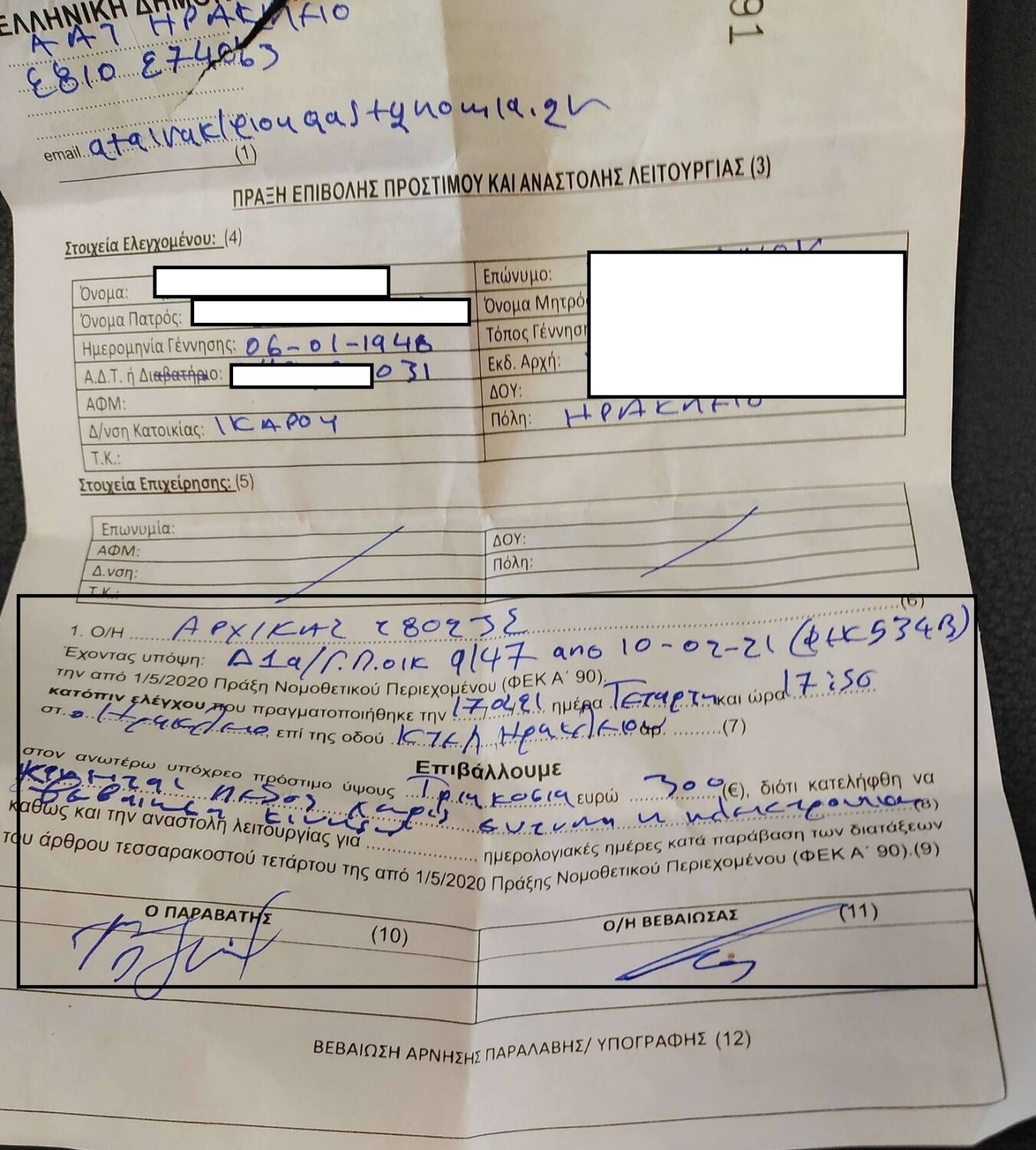 Η ΕΛ.ΑΣ στο Ηράκλειο Κρήτης έγραψε άστεγο επειδή δεν είχε χαρτί ή δεν έστειλε sms για να βρίσκεται έξω...