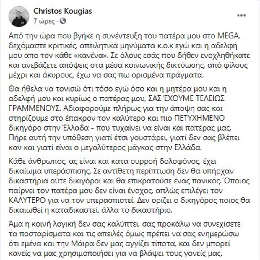«Θα ήθελα να τονίσω ότι τόσο εγώ όσο και η μητέρα μου και η αδελφή μου και κυρίως ο πατέρας μου, ΣΑΣ ΈΧΟΥΜΕ ΤΕΛΕΙΩΣ ΓΡΑΜΜΕΝΟΥΣ. Αδιαφορούμε πλήρως για την άποψη σας και στηρίζουμε στο έπακρον τον καλύτερο και πιο ΠΕΤΥΧΗΜΕΝΟ δικηγόρο στην Έλλαδα – που τυχαίνει να είναι και πατέρας μας. Πήρε αυτή την υπόθεση γιατί έτσι γουστάρει, γιατί δεν σας βλέπει καν και γιατί είναι ο μεγαλύτερος μάγκας στην Ελλάδα» αναφέρει μεταξύ άλλων…