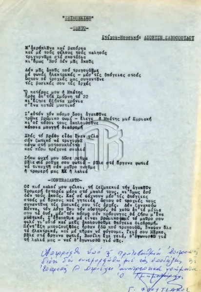 Τιμώντας τον μεγάλο Διονύση Σαββόπουλο, ο οποίος έφυγε χθες, Τρίτη 21 Οκτωβρίου, από τη ζωή, σε ηλικία 81 ετών, τα Γενικά Αρχεία του Κράτους έδωσαν στη δημοσιότητα τις αποφάσεις λογοκρισίας της Χούντας για το τραγούδι «Ζεϊμπέκικο» (Με αεροπλάνα και βαπόρια) που είχε γράψει το1972 ο σπουδαίος καλλιτέχνης.