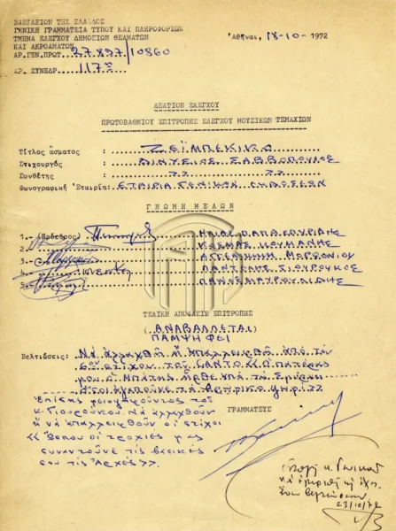Τα τεκμήρια της ανάρτησης αφορούν τη λογοκρισία του εμβληματικού τραγουδιού του Σαββόπουλου “Ζεϊμπέκικο” από την επιτροπή λογοκρισίας της Γενικής Γραμματείας Τύπου και Πληροφοριών το αρχείο της οποίας βρίσκεται στην Κεντρική Υπηρεσία των ΓΑΚ», ανέφερε στο Facebook η επίσημη σελίδα των Γενικών Αρχείων του Κράτους.
