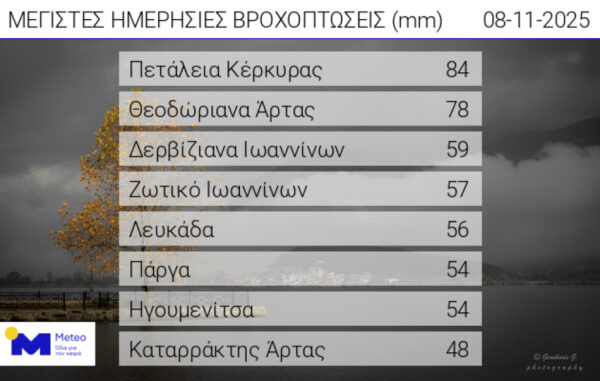 Αξιόλογα ύψη βροχής καταγράφηκαν κατά τόπους τις πρωινές ώρες του Σαββάτου 8 Νοεμβρίου 2025 στα δυτικά κυρίως σε τμήματα του Ιονίου και της Ηπείρου. Το μεγαλύτερο ύψος βροχής σύμφωνα με το δίκτυο αυτόματων μετεωρολογικών σταθμών του meteo.gr / Εθνικού Αστεροσκοπείου Αθηνών καταγράφηκε στην Πετάλεια Κέρκυρας με 84 mm. Στον παρακάτω πίνακα παρουσιάζονται τα 8 μεγαλύτερα ύψη βροχής.