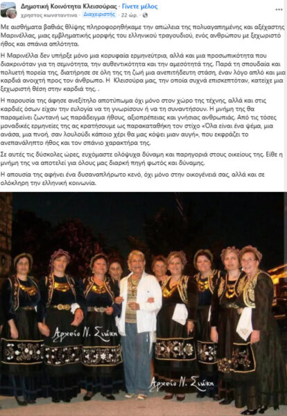 “Με αισθήματα βαθιάς θλίψης πληροφορηθήκαμε την απώλεια της πολυαγαπημένης και αξέχαστης Μαρινέλλας, μιας εμβληματικής μορφής του ελληνικού τραγουδιού, ενός ανθρώπου με ξεχωριστό ήθος και σπάνια απλότητα.