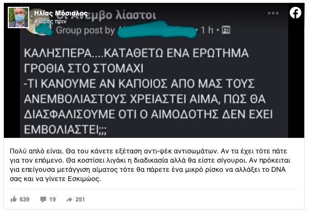 Κάποια σχόλια σε αυτές τις σελίδες είναι πραγματικά εξωφρενικά, όπως αυτό στο οποίο απάντησε ο Ηλίας Μόσιαλος, στο οποίο κάποιος ανησυχεί για το ενδεχόμενο να χρειαστεί μετάγγιση αίματος και ο δότης να είναι εμβολιασμένος…