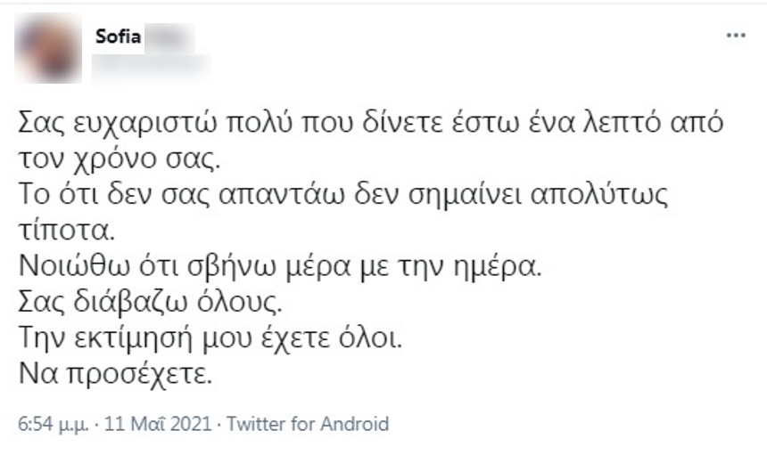 «Σας ευχαριστώ πολύ που δίνετε έστω ένα λεπτό από τον χρόνο σας. Το ότι δεν σας απαντάω δεν σημαίνει απολύτως τίποτα. Νιώθω ότι σβήνω μέρα με την ημέρα. Σας διαβάζω όλους. Την εκτίμησή μου έχετε όλοι. Να προσέχετε» ήταν το μήνυμά της στο twitter, το απόγευμα της Τρίτης.