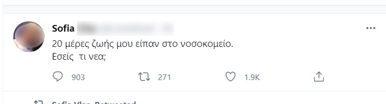 Πριν από λίγες μέρες η Σοφία έκανε μια ανάρτηση που σόκαρε τους φίλους της… “20 μέρες ζωής μου είπαν στο νοσοκομείο. Εσείς τι νέα”; Εκατοντάδες διαδικτυακοί της φίλοι προσπάθησαν να της στείλουν μηνύματα συμπαράστασης και ελπίδας…