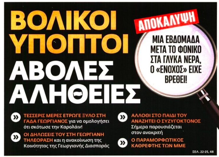 «Αν η Ελληνική Αστυνομία και οι συνδικαλιστές της υποστηρίζουν ότι γνώριζαν από την πρώτη στιγμή ότι ο σύζυγος ήταν ο δράστης του φονικού στα Γλυκά Νερά τότε γιατί προσπαθούσαν επί τετραήμερο να αποσπάσουν μια ψεύτικη ομολογία από έναν Γεωργιανό που συνέλαβαν στα σύνορα, ζητώντας του να πει ότι αυτός ήταν ο δολοφόνος της Καρολάιν;» ρωτούν οι δημοσιογράφοι της ΕφΣυν…
