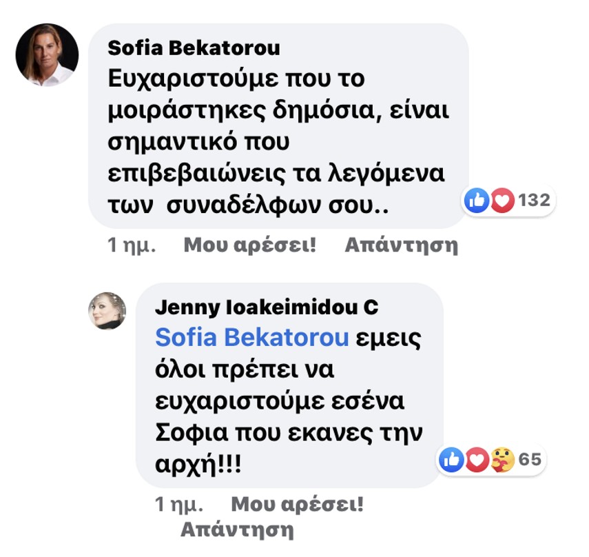 Η Σοφία Μπεκατώρου εξέφρασε δημόσια τη συμπαράστασή της προς εκείνη ενώ την ευχαρίστησε που τόλμησε να μοιραστεί δημόσια την άσχημη εμπειρία της.