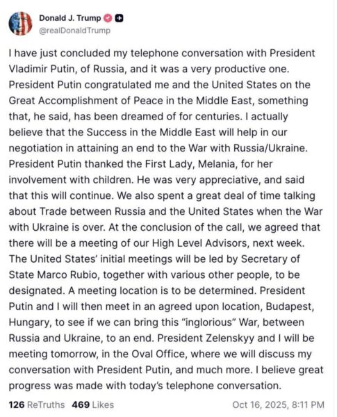 «Μόλις ολοκλήρωσα την τηλεφωνική μου συνομιλία με τον πρόεδρο Βλαντιμίρ Πούτιν της Ρωσίας, η οποία ήταν πολύ παραγωγική. Ο πρόεδρος Πούτιν συνεχάρη εμένα και τις Ηνωμένες Πολιτείες για το Μεγάλο Επίτευγμα της Ειρήνης στη Μέση Ανατολή, κάτι που, όπως είπε, ονειρευόταν εδώ και αιώνες. Πιστεύω πραγματικά ότι η Επιτυχία στη Μέση Ανατολή θα βοηθήσει στις διαπραγματεύσεις μας για την επίτευξη τερματισμού του πολέμου με τη Ρωσία και την Ουκρανία.