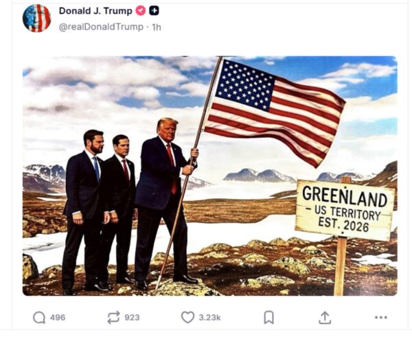 Στην φωτογραφία ο Τραμπ πλαισιώνεται από τον αντιπρόεδρος των ΗΠΑ, Τζέι Ντι Βανς, και τον ο Αμερικανό υπουργό Εξωτερικών, Μάρκο Ρούμπιο, ενώ υπάρχει και μια πινακίδα στην οποία αναγράφεται «Γροιλανδία, έδαφος των ΗΠΑ από το 2026».