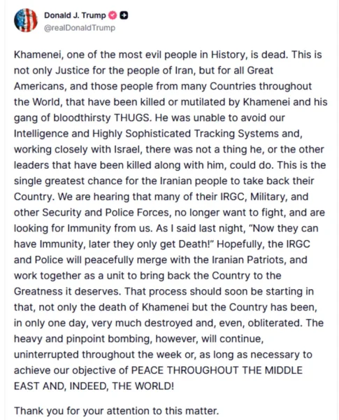 Οι φήμες οργίαζαν, μέχρι που ο Ντόναλντ Τραμπ προχώρησε σε ανακοίνωση. «Ένας από τους πιο κακούς ανθρώπους στην Ιστορία είναι νεκρός», έγραψε στο Truth Social. Σύμφωνα με τον Τραμπ, ο Χαμενεΐ εντοπίστηκε σε συνεργασία με το Ισραήλ μέσω «εξαιρετικά εξελιγμένων συστημάτων πληροφοριών». Στόχος της επιχείρησης είναι η αλλαγή καθεστώτος. Όπως είπε, είναι «η μεγαλύτερη ευκαιρία για τον ιρανικό λαό να πάρει πίσω τη χώρα του». Πρόσθεσε ότι δυνάμεις των Φρουρών της Επανάστασης και των σωμάτων ασφαλείας «δεν θέλουν πλέον να πολεμήσουν». Παράλληλα, ισραηλινοί αξιωματούχοι ανέφεραν ότι η σορός του ανακτήθηκε.