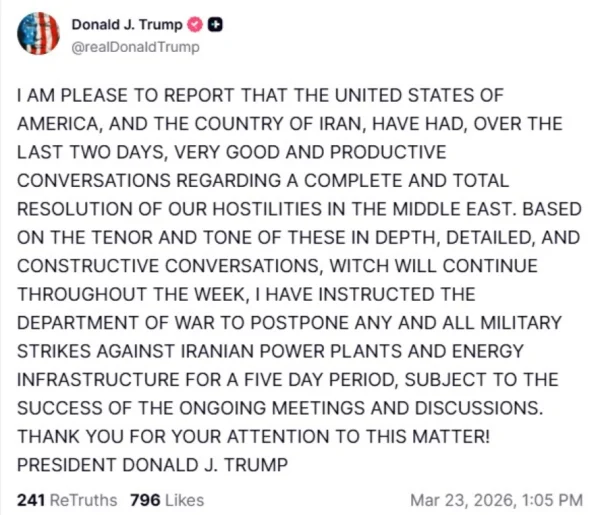 Ο Αμερικανός πρόεδρος ανακοίνωσε ότι, με βάση την πορεία των συνομιλιών, έδωσε εντολή στο υπουργείο Πολέμου να αναβάλει για πέντε ημέρες οποιαδήποτε στρατιωτική επιχείρηση που θα στόχευε ιρανικές μονάδες παραγωγής ενέργειας και κρίσιμες ενεργειακές υποδομές.