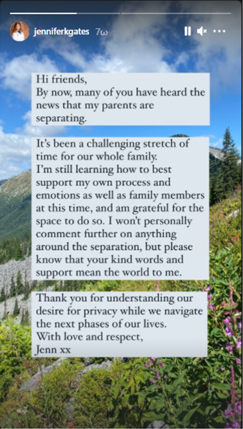 Η 25χρονη Τζένιφερ Γκέιτς, κόρη του διάσημου ζευγαριού, έγραψε στο instagram της ότι η συγκεκριμένη περίοδος είναι δύσκολη για ολόκληρη την οικογένεια και ζήτησε χώρο και σεβασμό της ιδιωτικότητάς της. Τα αδέλφια της, ο 21χρονος Ρόρι και η 18χρονη Φίμπι δεν έχουν κάνει ακόμα κάποια δήλωση.