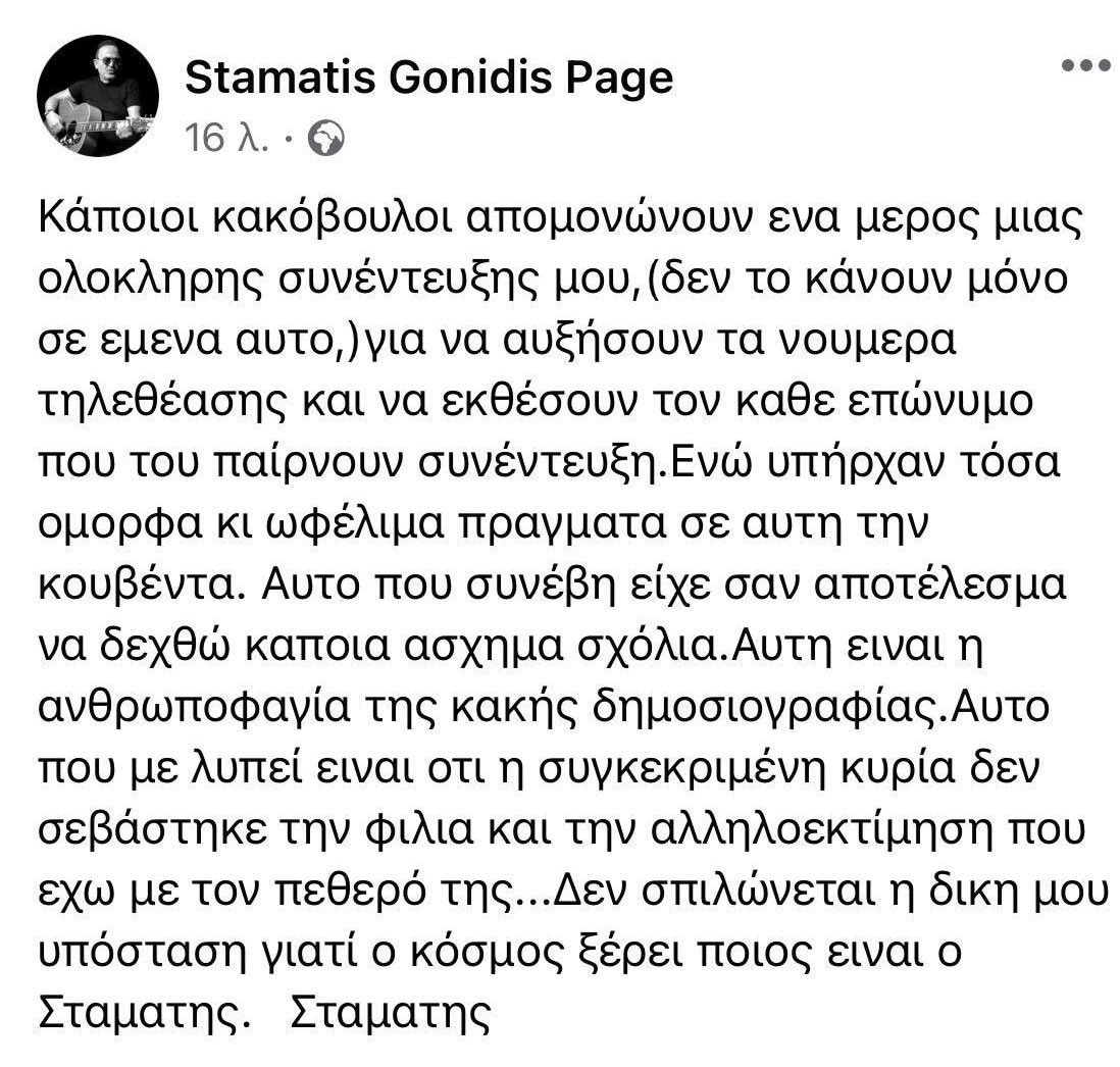 “Κάποιοι κακόβουλοι απομονώνουν ένα μέρος μιας ολόκληρης συνέντευξής μου (δεν το κάνουν μόνο σε εμένα αυτό) για να αυξήσουν τα νούμερα τηλεθέασης και να εκθέσουν τον κάθε επώνυμο που παίρνουν συνέντευξη. Ενώ υπήρχαν τόσο όμορφα και ωφέλιμα πράγματα σε αυτή την κουβέντα. Αυτό που συνέβη είχε σαν αποτέλεσμα να δεχθώ κάποια άσχημα σχόλια. Αυτή είναι η ανθρωποφαγία της κακής δημοσιογραφίας. Αυτό που με λυπεί είναι ότι η συγκεκριμένη κυρία δε σεβάστηκε τη φιλία και την αλληλοεκτίμηση που έχω με τον πεθερό της… Δεν σπιλώνεται η δική μου υπόσταση γιατί ο κόσμος ξέρει ποιος είναι ο Σταμάτης”.