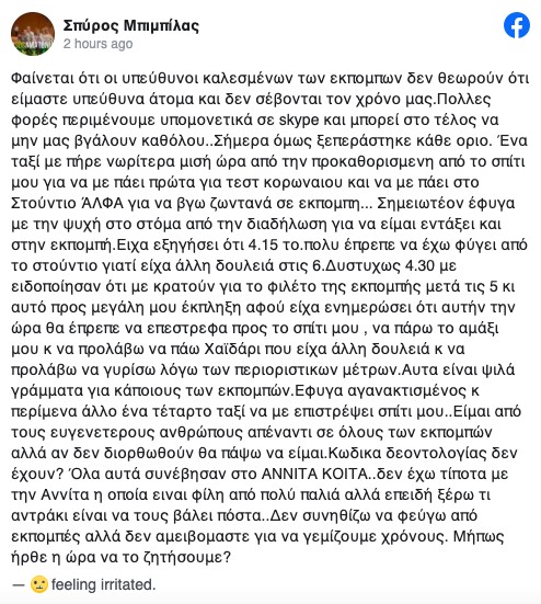Σημειωτέον έφυγα με την ψυχή στο στόμα από την διαδήλωση για να είμαι εντάξει και στην εκπομπή. Είχα εξηγήσει ότι 4.15 το πολύ έπρεπε να έχω φύγει από το στούντιο γιατί είχα άλλη δουλειά στις 6.Δυστυχως 4.30 με ειδοποίησαν ότι με κρατούν για το φιλέτο της εκπομπής μετά τις 5 κι αυτό προς μεγάλη μου έκπληξη αφού είχα ενημερώσει ότι αυτήν την ώρα θα έπρεπε να επέστρεφα προς το σπίτι μου , να πάρω το αμάξι μου κ να προλάβω να πάω Χαϊδάρι που είχα άλλη δουλειά κ να προλάβω να γυρίσω λόγω των περιοριστικών μέτρων. Αυτά είναι ψιλά γράμματα για κάποιους των εκπομπών. Έφυγα αγανακτισμένος κ περίμενα άλλο ένα τέταρτο ταξί να με επιστρέψει σπίτι μου.. Είμαι από τους ευγενέστερους ανθρώπους απέναντι σε όλους των εκπομπών αλλά αν δεν διορθωθούν θα πάψω να είμαι. Κώδικα δεοντολογίας δεν έχουν? Όλα αυτά συνέβησαν στο ΑΝΝΙΤΑ ΚΟΙΤΑ.. δεν έχω τίποτα με την Αννίτα η οποία είναι φίλη από πολύ παλιά αλλά επειδή ξέρω τι αντράκι είναι να τους βάλει πόστα.. Δεν συνηθίζω να φεύγω από εκπομπές αλλά δεν αμειβόμαστε για να γεμίζουμε χρόνους. Μήπως ήρθε η ώρα να το ζητήσουμε;».