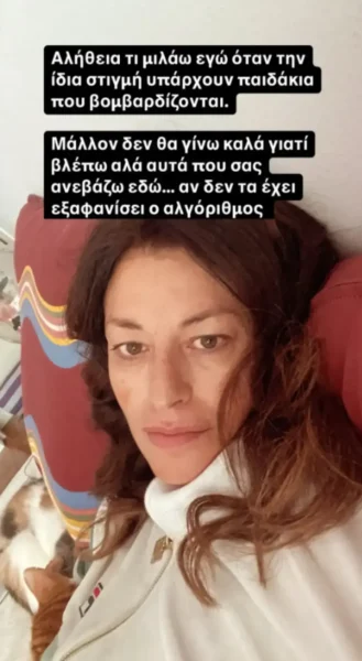 Σε δεύτερη ανάρτηση, ωστόσο, εξέφρασε και την αγωνία της για όσα συμβαίνουν στον κόσμο, συνδέοντας την προσωπική της μάχη με τις εικόνες από τον πόλεμο. «Αλήθεια, τι μιλάω εγώ όταν την ίδια στιγμή υπάρχουν παιδάκια που βομβαρδίζονται. Μάλλον δεν θα γίνω καλά γιατί βλέπω όλα αυτά που σας ανεβάζω εδώ… αν δεν τα έχει εξαφανίσει ο αλγόριθμος», έγραψε.