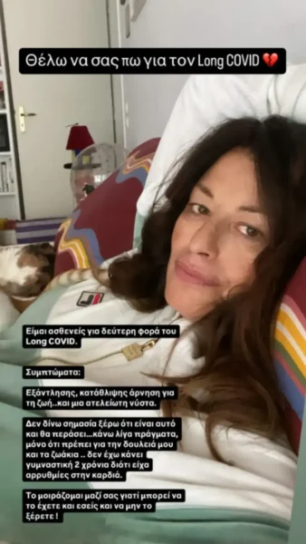 «Θέλω να σας πω για τον Long COVID. Είμαι ασθενής για δεύτερη φορά του Long COVID. Συμπτώματα: Εξάντληση, κατάθλιψης, άρνηση για τη ζωή… και μια ατελείωτη νύστα. Δεν δίνω σημασία, ξέρω ότι είναι αυτό και θα περάσει… Κάνω λίγα πράγματα, μόνο ό,τι πρέπει για την δουλειά μου και τα ζωάκια. Δεν έχω κάνει γυμναστική 2 χρόνια, διότι είχα αρρυθμίες στην καρδιά», έγραψε.
