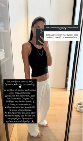 Όσον αφορά στα κιλά της εγκυμοσύνης και το πώς τα έχασε η Αλεξάνδρα Νίκα απάντησε: «Η αλήθεια είναι πώς κάθε σώμα είναι διαφορετικό και χρειάζεται τον χρόνο του. Εγώ δεν έκανα κάτι “μαγικό”, με βοήθησε πολύ ο θηλασμός, η κίνηση με το μωρό στην καθημερινότητα και να προσπαθώ να τρώω ισορροπημένα. Το πιο σημαντικό για μένα ήταν να νιώσω υγιής…».