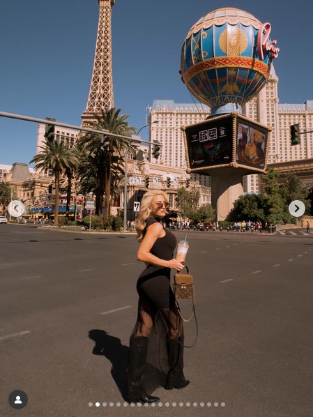 Σε μία από τις φωτογραφίες, ποζάρει μπροστά από το γνωστό Paris Las Vegas Hotel με φόντο τον Πύργο του Άιφελ, φορώντας ένα καφέ φόρεμα με διαφάνεια, ψηλές μπότες και κρατώντας την αγαπημένη της Louis Vuitton τσάντα.