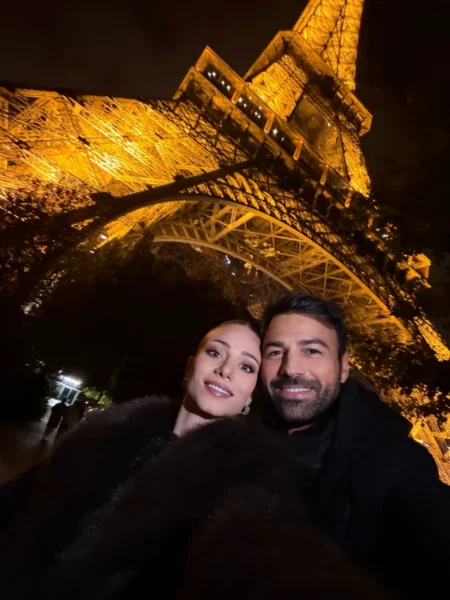 Σε μία από τις φωτογραφίες, το ζευγάρι ποζάρει με φόντο τον εμβληματικό Πύργο του Άιφελ, ενώ σε μια άλλη ανταλλάσσει ένα τρυφερό φιλί κάτω από τον παριζιάνικο ουρανό