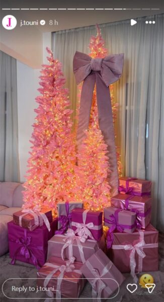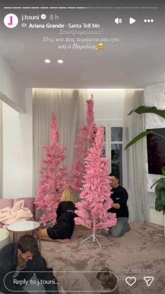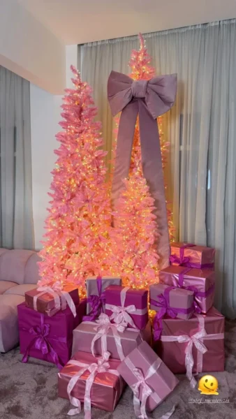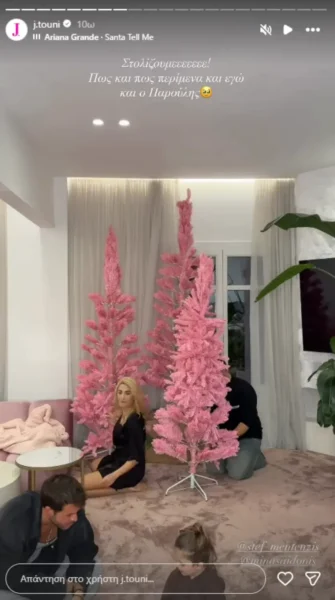 Ωστόσο, αντί για το κλασικό χριστουγεννιάτικο δέντρο, η Ιωάννα Τούνη επέλεξε τρία ροζ έλατα, στα οποία έβαλε λαμπάκια κι ένα μεγάλο ροζ φιόγκο, αντί για στολίδια.