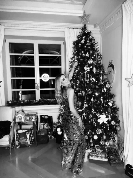 Η πρώην παρουσιάστρια φόρεσε μια τουαλέτα με παγέτες και ψηλοτάκουνα πέδιλα και πήρε διάφορες πόζες στο σαλόνι του σπιτιού της με φόντο το χριστουγεννιάτικο δέντρο.