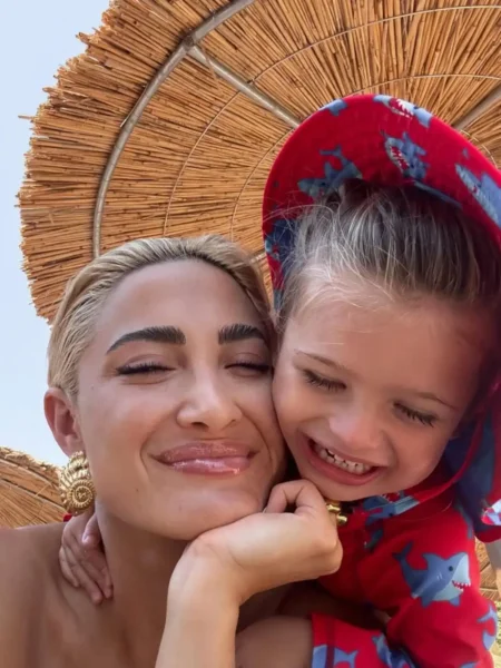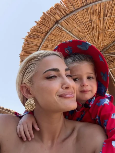 Πρόκειται για δύο στιγμιότυπα από την παραλία με την γνωστή influencer να ποζάρει σε χαλαρές στιγμές βγάζοντας selfie με τον γιο της.