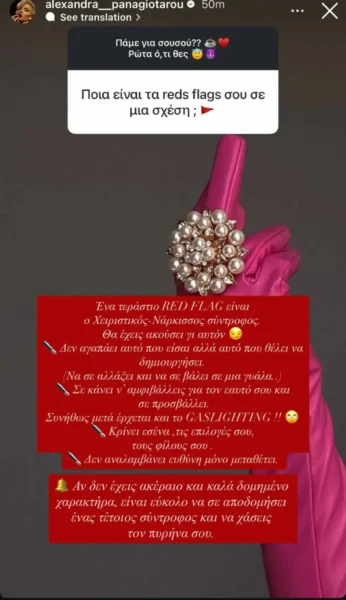Στο ίδιο Q&A, η Αλεξάνδρα Παναγιώταρου ρωτήθηκε για το ποια είναι τα μεγαλύτερα red flags (κόκκινες γραμμές) σε μια σχέση, με την ίδια να απαντά πως ένα από αυτά είναι ο χειριστικός και νάρκισσος σύντροφος.