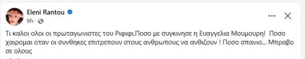 Η Ελένη Ράντου, είδε επίσης το τελευταίο επεισόδιο και αποθέωσε την Ευαγγελία Μουμούρη.