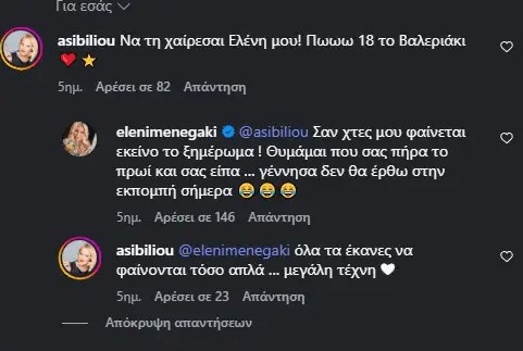 «Να τη χαίρεσαι Ελένη μου! Πωωω 18 το Βαλεριάκι» έγραψε η αστρολόγος με την Ελένη Μενεγάκη να της απαντά, «Σαν χθες μου φαίνεται εκείνο το ξημέρωμα! Θυμάμαι που σας πήρα το πρωί και σας είπα, γέννησα, δε θα έρθω στην εκπομπή σήμερα».