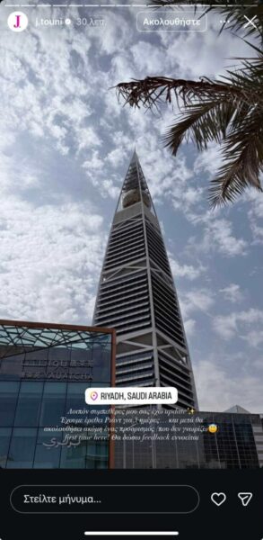 «Λοιπόν συμπεθέρες μου σας έχω update. Έχουμε έρθει Ριάντ για 3 μέρες… και μετά θα ακολουθήσει ακόμη ένας προορισμός που δεν γνωρίζω. Πρώτη φορά εδώ ! Θα δώσω feedback εννοείται» έγραψε χαρακτηριστικά η Ιωάννα Τούνη στο Instagram και δημοσίευσε μια φωτογραφία από την Σαουδική Αραβία.