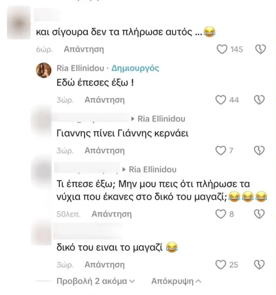 «Και σίγουρα δεν τα πλήρωσε αυτός», «Γιάννης πίνει, Γιάννης κερνάει», «δικό του είναι το μαγαζί», ήταν μερικά από τα σχόλια που έγραψαν κάτω από το βίντεο της Ρίας Ελληνίδου.