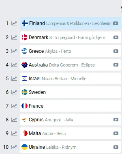 Η Φινλανδία, την οποία εκπροσωπούν οι Linda Lampenius και Pete Parkkonen με το «Liekinheitin», συνεχίζει να βρίσκεται στην πρώτη θέση.