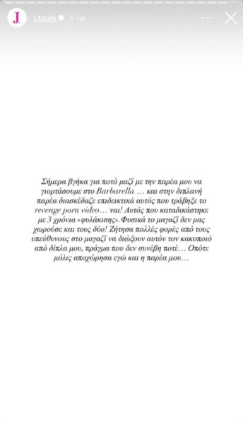 «Σήμερα βγήκα για ποτό μαζί με την παρέα μου να γιορτάσουμε και στην διπλανή παρέα διασκέδαζε αυτός που τράβηξε το revenge porn video… ναι! Αυτός που καταδικάστηκε με 3 χρόνια «φυλάκισης». Φυσικά το μαγαζί δεν μας χωρούσε και τους δυο! Ζήτησα πολλές φορές από τους υπεύθυνους στο μαγαζί να διώξουν αυτόν τον κακοποιό από δίπλα μου, πράγμα που δεν συνέβη ποτέ.. Οπότε μόλις αποχώρησα εγώ και η παρέα μου…», έγραψε στην ανάρτησή της η Ιωάννα Τούνη.