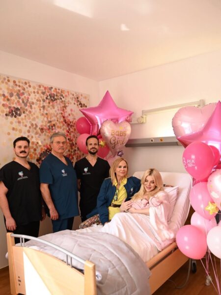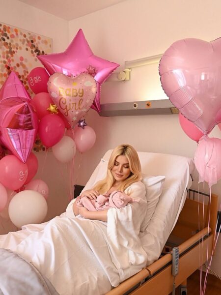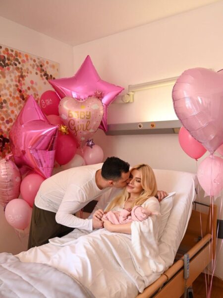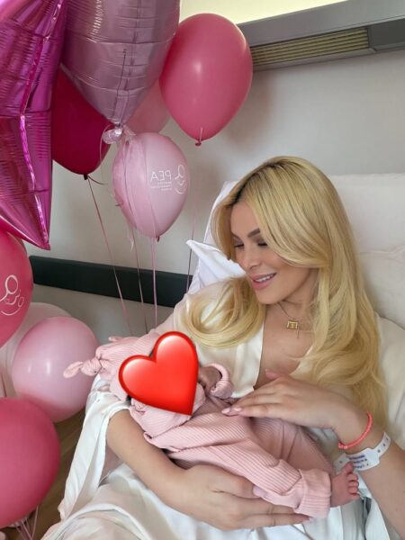 Στις εικόνες που δημοσίευσε, το δωμάτιο στο μαιευτήριο είναι γεμάτο ροζ μπαλόνια και διακοσμητικά, δημιουργώντας ένα σκηνικό γιορτής για τον ερχομό της μικρής Πολυξένης-Αλεξάνδρας. Δίπλα της βρίσκεται και ο σύντροφός της, Παναγιώτης Κουτσουμπής, με τον οποίο μοιράζεται αυτές τις πρώτες, μοναδικές στιγμές ως γονείς πλέον.