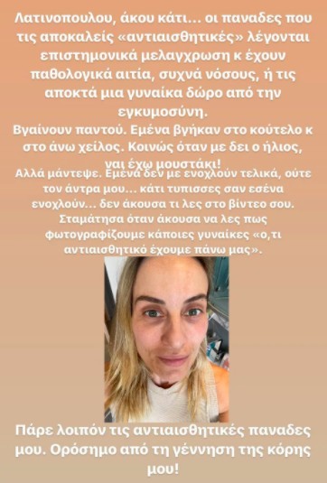 Η πολιτευτής της ΝΔ σε βίντεο στα σόσιαλ μίντια είχε πει χαρακτηριστικά για άλλες γυναίκες: «Αφήνουν τρίχες στα πόδια και το φωτογραφίζουν, τρίχες στη μασχάλη, τρίχες στο μουστάκι, ραγάδες, πανάδες, κυτταρίτιδα και οτιδήποτε άλλο αντιαισθητικό υπάρχει πάνω τους», κάτι που όπως είπε, την κάνει να «νιώθει άβολα», να «αισθάνεται ντροπή» και να «απεχθάνεται να βλέπει τέτοιου είδους φωτογραφίες ως γυναίκα».