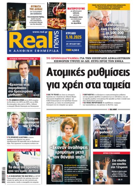 Με κεντρικό τίτλο «Ατομικές ρυθμίσεις για χρέη στα ταμεία» κυκλοφορεί αυτή την Κυριακή, 5 Οκτωβρίου, η «Realnews».