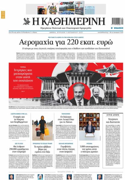 Με κεντρικό τίτλο «Αερομαχία για 220 εκατ. ευρώ» – Πού πάνε τα λεφτά για την ασφάλεια στους αιθέρες. Η κόντρα με τους ελεγκτές εναέριας κυκλοφορίας και η διάθεση των κονδυλίων του Eurocontrol κυκλοφορεί αυτή την Κυριακή, 5 Οκτωβρίου 2025, η «Καθημερινή».